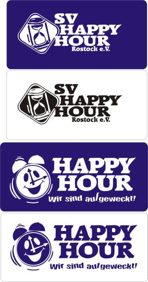 Nachdem ich Hans-Jürgen S. mitteilte, dass auch ich "Happy Hour" im Sinne der "glücklichen bzw. frohen Stunde" verstehe, bat ich ihn, anstelle des Stundenglases, einen glücklichen bzw. frohen Wecker in das Logo einzuarbeiten. Zudem wies ich auf unseren vollständigen Vereinsnamen "SV Happy Hour Rostock e. V." hin, welcher meines Erachtens entweder vollständig oder nur als "Happy Hour" erscheinen sollte. Schließlich hatte ich den Gedanken, das Ganze mit einem fetzigen Spruch (Wir sind aufgeweckt!) zu ergänzen. Anbei die daraus resultierenden zweiten Entwürfe von Hans-Jürgen S.: